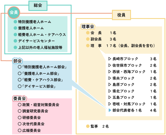 長崎県老人福祉施設協議会は、長崎県内の社会福祉法人や行政が経営及び運営する「特別養護老人ホーム」「養護老人ホーム」「軽費老人ホーム・ケアハウス」「デイサービスセンター」などで構成されています。